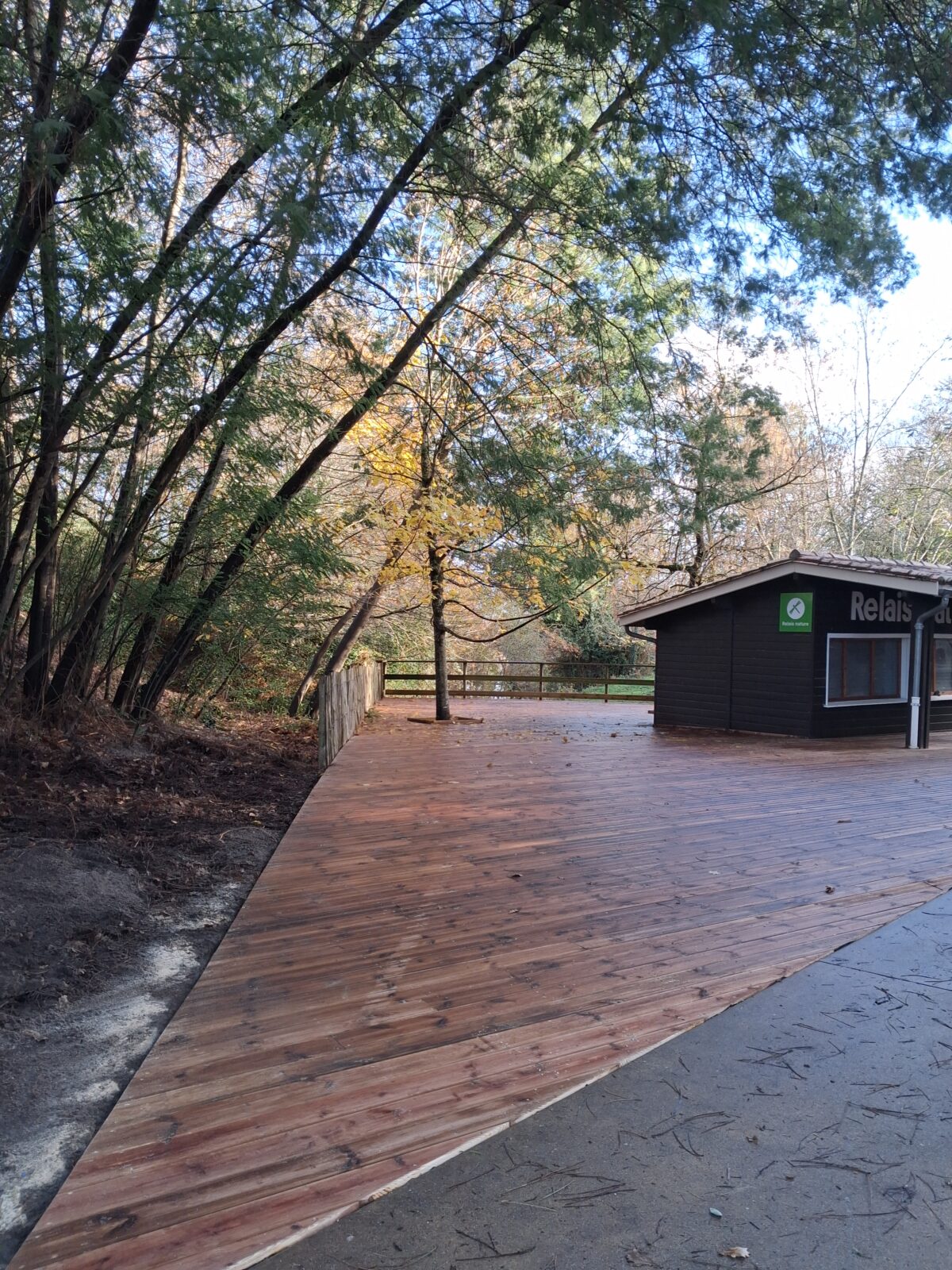 belle terrasse bois en sapin rouge du nord .pose en double ossature sur terrain naturel .chois du bois US marron