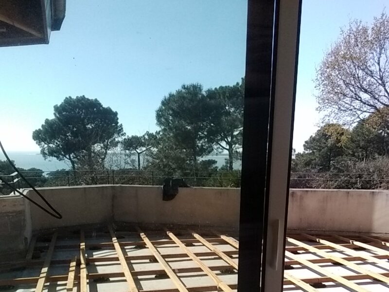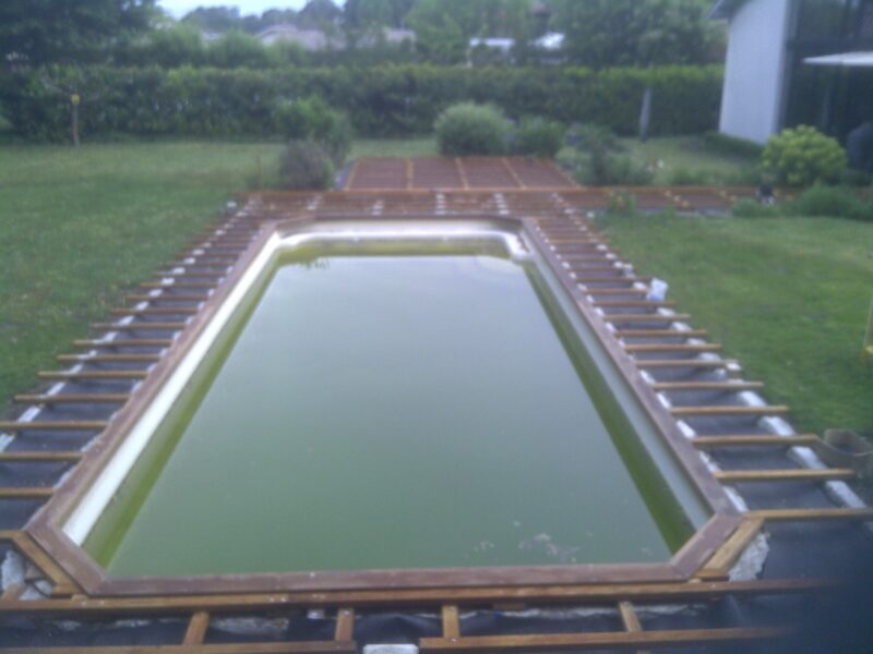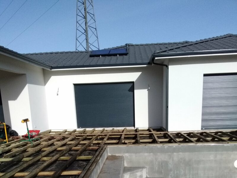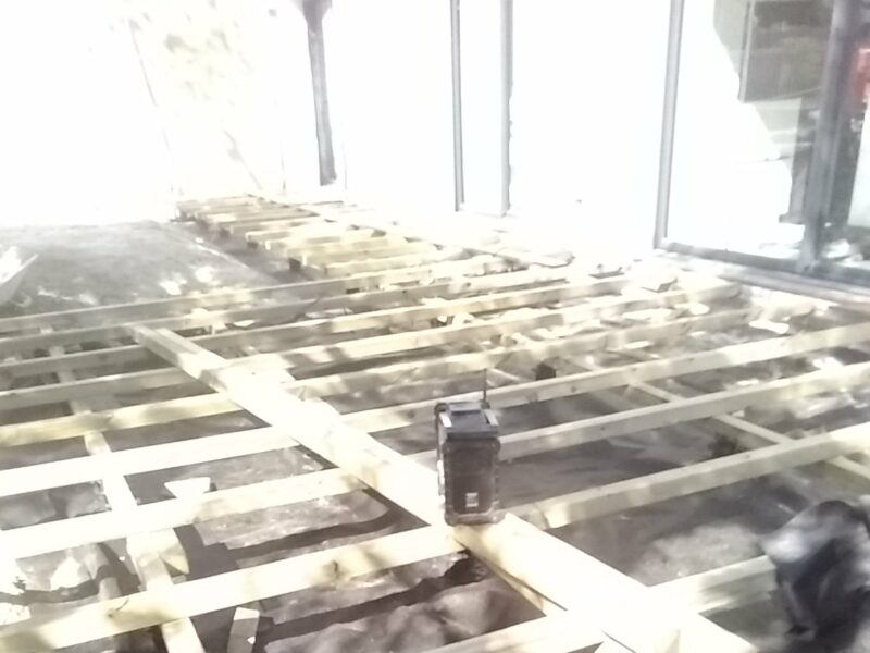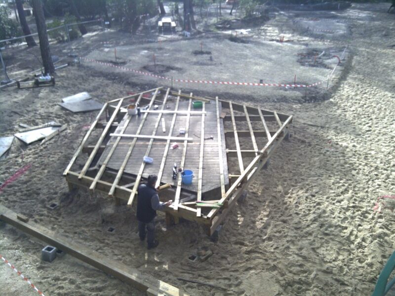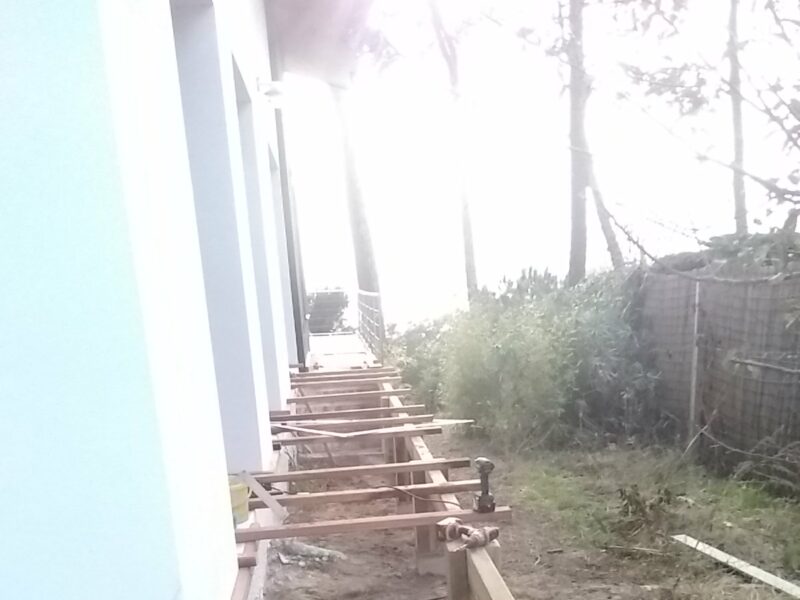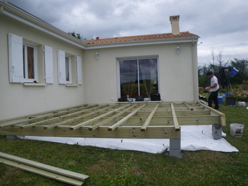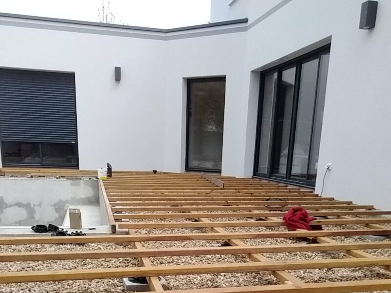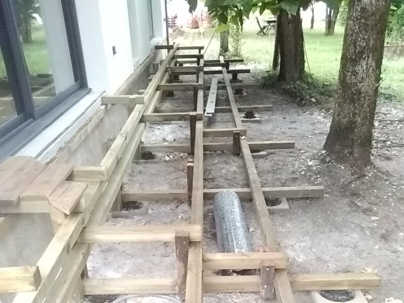 réhabilitation d une terrasse bois .remplacement complet de l ossature et du platelage . repose d une structure en double ossature sur dalle béton et plots .lames de sapin classe 4 marron .