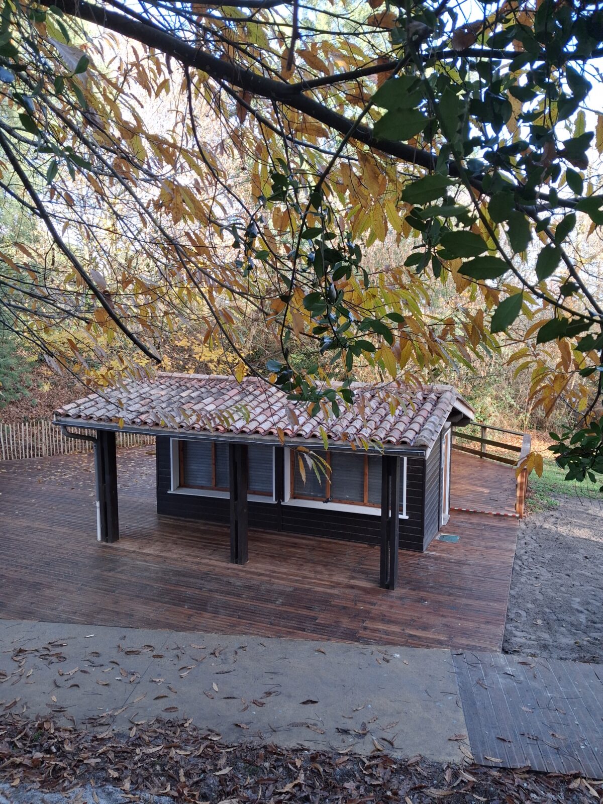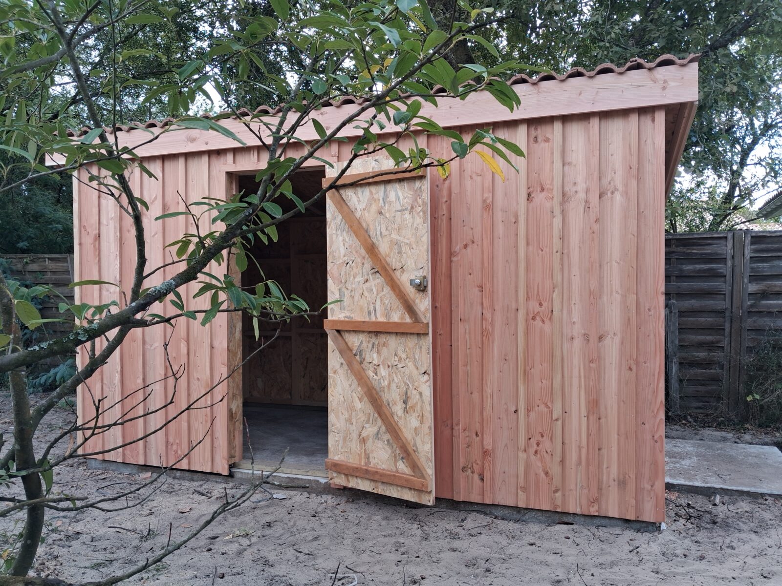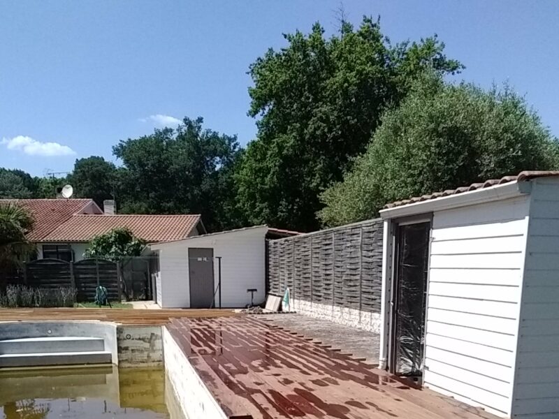 réalisation d un cabanon ossature bois et local de la piscine .bardage bois volige douglas et couvre joint .toiture une pente en tuile .